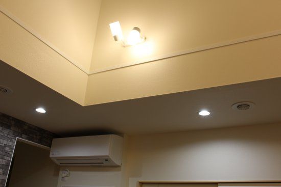 写真では分かりづらいですが、リビングの照明は白、吹抜けの照明は温白色、といった違いがあります。