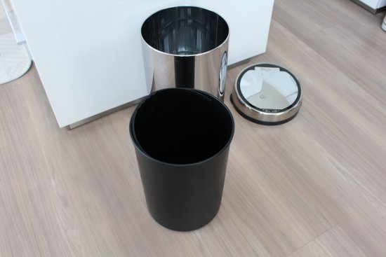 このゴミ箱、手をかざすと蓋が開き、数秒経つと自動的に閉じます。